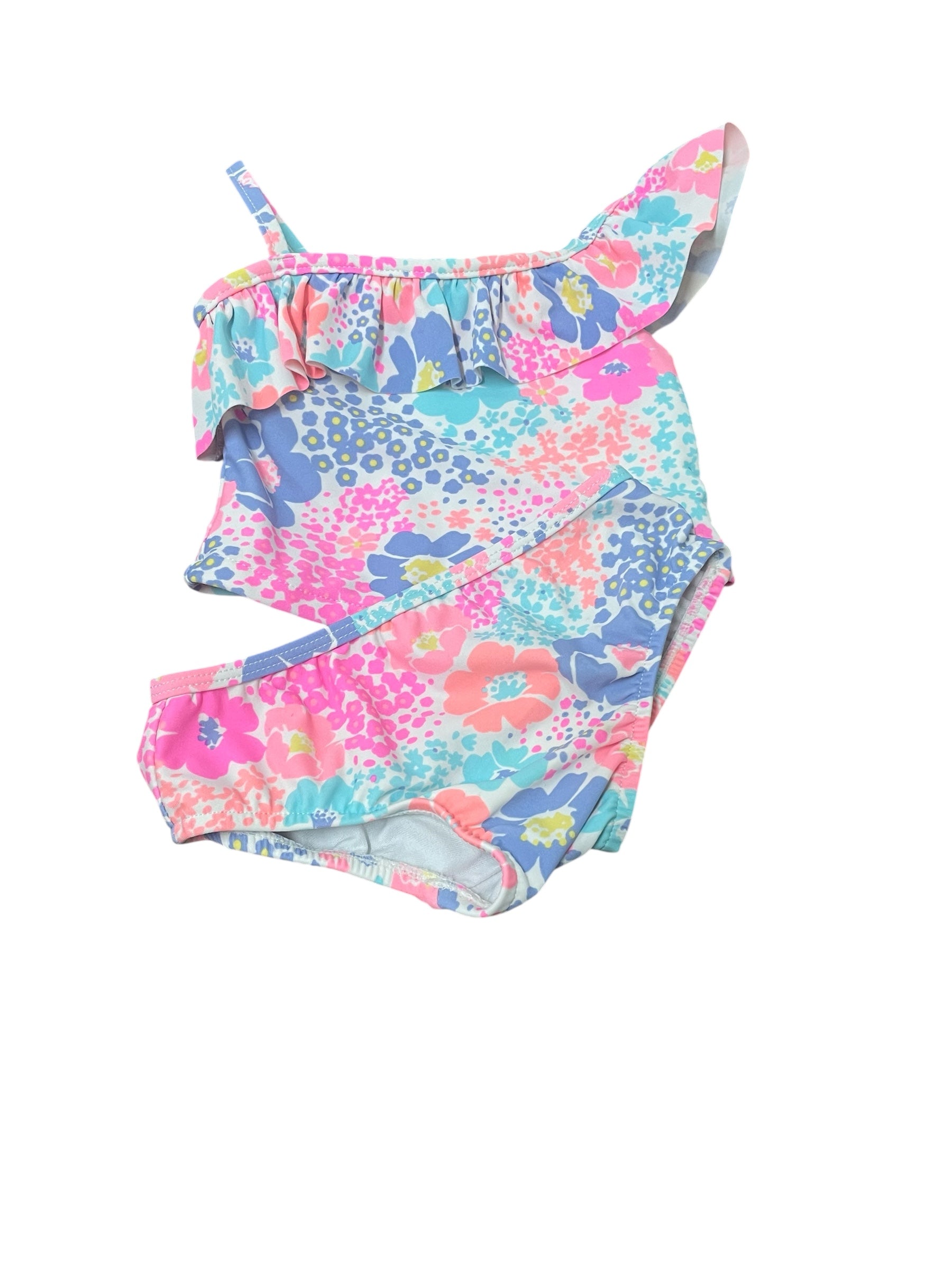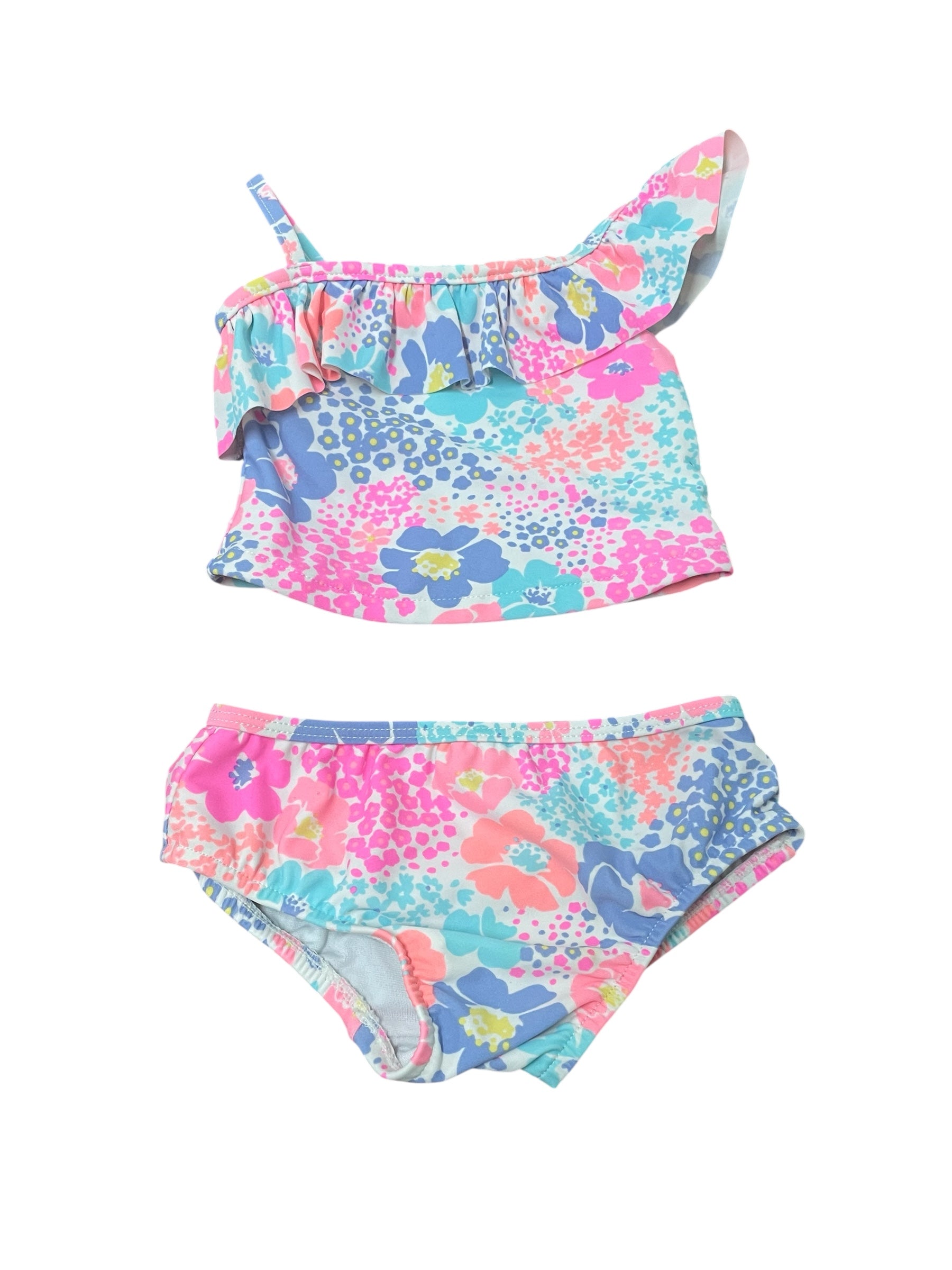 Colourful floral 2 piece with one ruffled shoulder.