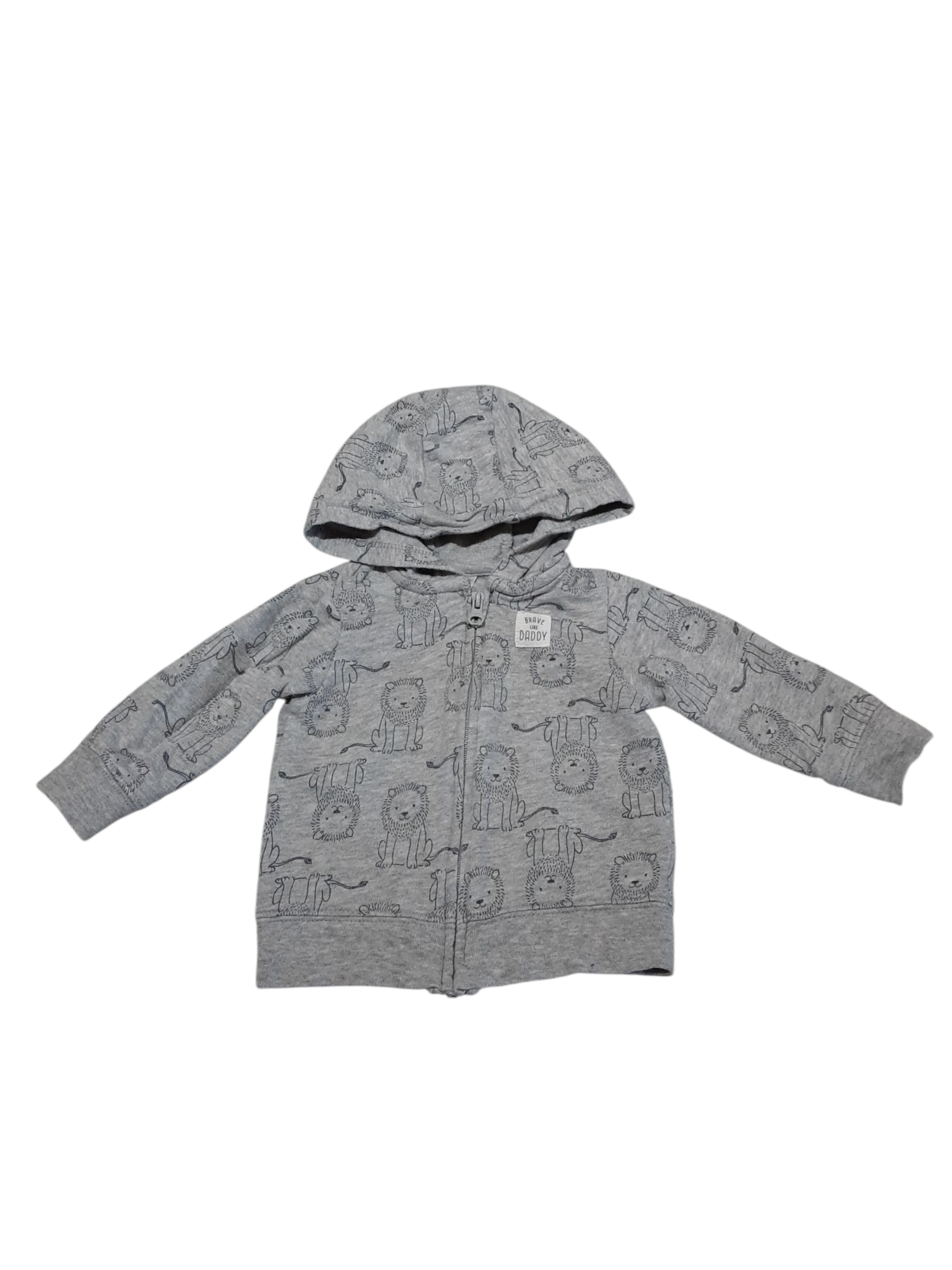 Grey sweater with lion print, and small patch that says "brave like daddy". Carter's brand, size 3-6m