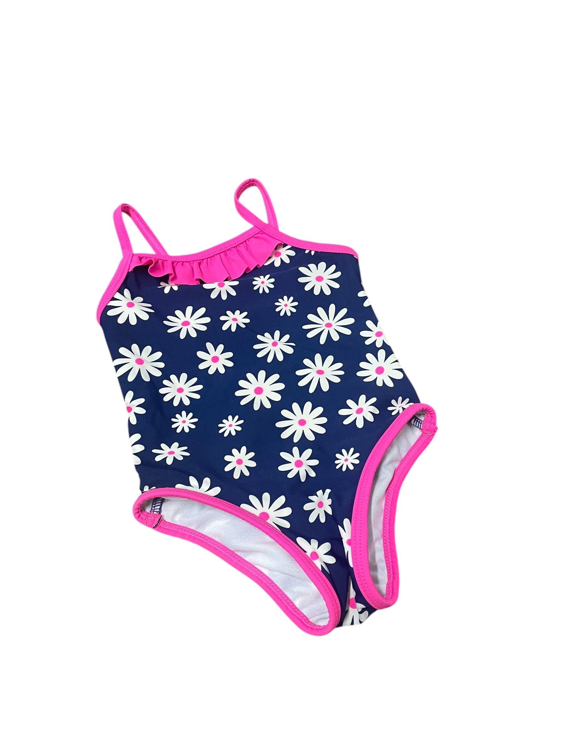 Navy Swim Suit with pink details and daisies. Made by George size 6/12 Months.
